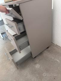 3 cassetti di varie misure , sportellino, cassetto verticale con 3 ripiani di varie misure, buchi passacavi su tavolo e in varie zone sotto il tavolo, foro 16 cm per aspiratore!
