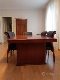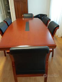 Il tavolo è completato da n. 6 poltrone per conferenza in ecopelle nera con struttura e braccioli in legno. Linea Meeting di Arrediorg. Dimensioni poltrone h 92 cm seduta 46x48. Nuovo mai utilizzato.
