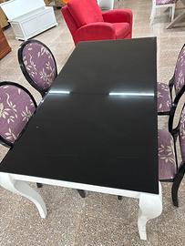 Tavolo base vianca piano vetro nero fisso cm 180 con n.4 sedie nere rivestite colore viola come foto