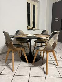Vendo per trasloco tavolo rotondo piano in legno e piede in metallo, dimensione 120cm + 4 sedie di design piedi in legno e tessuto. Vendo per passaggio a dimensioni diverse, no perditempo, non spedisco