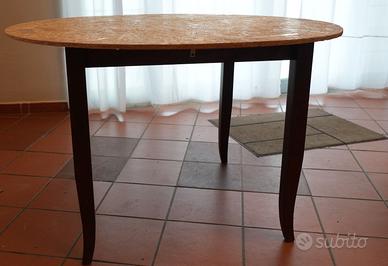Vendo tavoli rotondi con piano in pannello OSB laccato e gambe in legno scuro tornito.