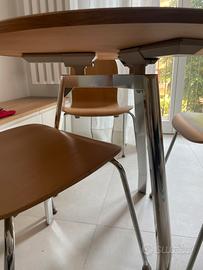 Bel tavolo rotondo con diametro di 90 cm. Piano sospeso in rovere impiallacciato. Gambe in metallo lucido. Ritiro in Milano città