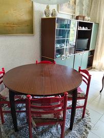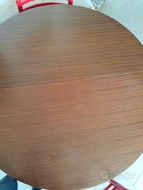 Set completo tavolo rotondo allungabile in legno e 4 sedie coordinate. Eventualmente scorporabile. Il tavolo ha struttura solida, piano impiallacciato effetto teak/noce e allunga originale. Le sedie sono in legno verniciato rosso con seduta in paglia intrecciata originale, integra e ben tesa. Normali segni del tempo, insieme ben tenuto e pronto all’uso. Cuscini coordinati inclusi. Ritiro a Cogoleto. Prezzo trattabile. Pagamento in contanti alla consegna del materiale.