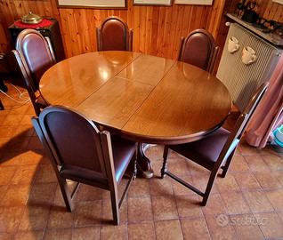 Tavolo in legno rotondo, allungabile, con 6 sedie in legno rivestite in pelle. Misure tavolo chiuso diametro 116cm altezza 78cm. Misure tavolo aperto 116cm x 154cm. Ritiro e smontaggio a carico dell'acquirente. Ritiro in loco, no spedizioni.
