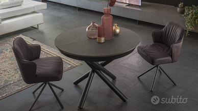 L TAVOLO CIRCOLARE Fahrenheit SI ALLUNGA E DIVENTA OVALE SENZA PERDERE IL SUO FASCINO. LO SPESSORE INCLINATO SOTTO AL PIANO FA SCIVOLARE LO SGUARDO VERSO IL SOSTEGNO CENTRALE CHE CON UN EFFETTO DINAMICO ARREDA SPAZI IN CONTINUA EVOLUZIONE.DIMENSIONI CHIUSO DIAM. CM 105 ( APERTO 105 X 165 ) ALTEZZA CM 75