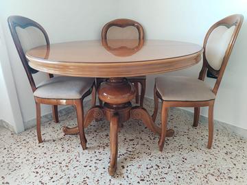 Tavolo rotondo in legno, allungabile diventa ovale, con base in trepiedi e 5 sedie. P. S. per correttezza ha qualche imperfezione
