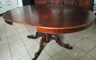 Vendo tavolo rotondo allungabile in legno, struttura solida e decorata, ideale per cucina o sala da pranzo.