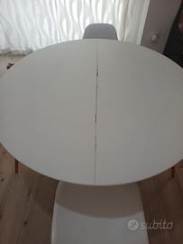 Vendesi tavolo rotondo bianco allungabile da sala e/o da cucina completo di 4 sedie bianche con piedi in legno chiaro.