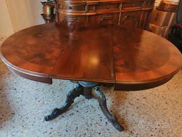 Tavolo Rotondo degli Anni '80 realizzato in Legno massello. Allungabile, si apre diventando Ovale. Diametro (da chiuso) 120 cm. Larghezza totale (da aperto) 160 cm. Altezza: 75 cm. Solo ritiro in luogo, a Firenze. Smontaggio e trasporto a carico di chi lo acquista.