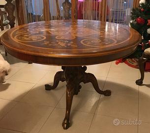 Tavolo rotondo in legno con intarsiato con disegno classico. Misure circonferenza 124 altezza 78 cm. Possibilità di acquistare anche le sedie uguali .