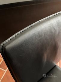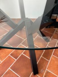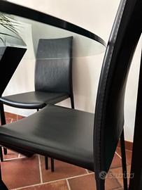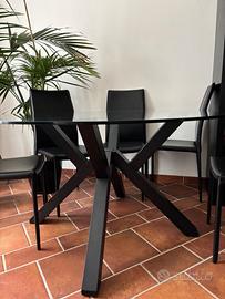 Tavolo da pranzo rotondo con piano in vetro temperato e una base centrale in legno scuro con gambe incrociate. 6 sedie nere in pelle comprese nel prezzo. Tavolo diametro 140 cm. Possibile vendita separata.