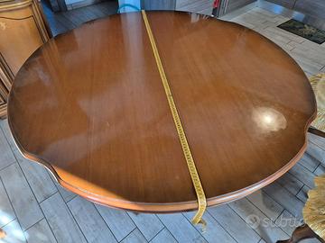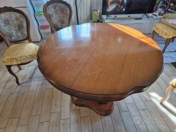 Tavolo rotondo, espandibile, in legno di una volta. No graffi o zone rovinate. Traballo solo un po', cosa rimediabile con una zeppa. Abbinato alle sue sedie in legno, di numero 6, ricamate e recentemente rifoderate.