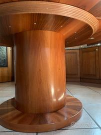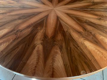 Vendo tavolo rotondo da cm 160 H 78, elemento di alta artigianalità con struttura lignea di multistrato impiallacciato di Noce Nazionale Colore (Junglans Regia) con dettagli di ricavo dei vari elementi che compongono la raggiera dalla parte bassa del tronco di Noce scelto per avere il risultato come foto, bordo massello incollato e successivamente doppia applicazione di tranciato in senso vena incrociato per dare stabilità al top che è composto da 2 mezzelune unite tra di esse con sottotop rotondo di grosso spessore e la stabilità è garantita da nr 3 tiranti ad incasso a scomparsa totale sottostanti, il basamento rotondo lavorato con la stessa maestria in tema con il top, il tavolo è stato usato ma si trova in buone condizioni, è smontabile per un trasporto ottimizzato, il prezzo è inteso con ritiro diretto a casa nostra del materiale imballato per il carico ed il trasporto a cura e carico acquirente.