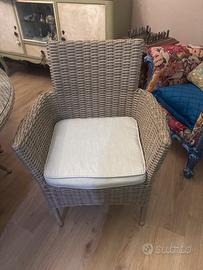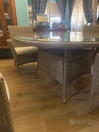Set composto da un tavolo da pranzo rotondo da esterno 140 cm con struttura in alluminio e rattan sintetico intrecciato a mano e piano in vetro, il tabolo è completente smontabile, color marrone beige chiaro, 4 sedie da giardino con braccioli inpilabili con cuscino incluso. I cuscino sono sfoderabili e lavabili. Tenuto maniacalmente dentro casa, come nuovo. Ritiro sul posto. Prezzo nuovo 1400€