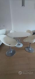 piano circolare in vetro temperato bianco (diametro 121 cm) sostenuto da una base centrale in tondini in acciaio cromati e da poggiapiedi a forma di anello in ghisa.