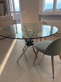 Vendesi tavolo rotondo con piano in vetro temperato e struttura centrale in acciaio cromato con gambe incociate a razza. Stile Calligaris (purtroppo non sono certa sia di marca).