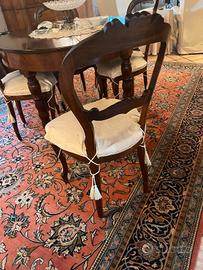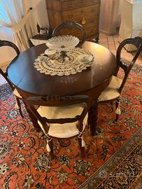 Tavolo in noce, con 4 sedie con fodera nuova. estendibile a 6 posti, prolunghe comprese nella vendita. Legno mantenuto e trattato. incluso nel prezzo anche tovaglia su misura e mollettone. Ritiro a carico dell'acquirente.