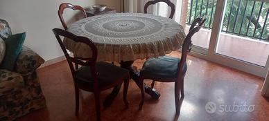 Tavolo rotondo diametro cm 113 allungabile a 154 cm Luigi Filippo , piano in noce perfetto . 6 sedie in noce con seduta da rifare. Tavolo e sedie 250 euro , solo tavolo 200.
