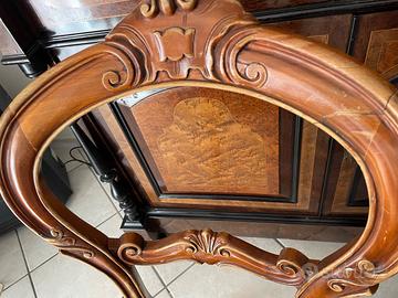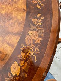 Tavolo rotondo antico con intarsi e 6 sedie completo di prolunghe per 12 persone