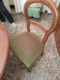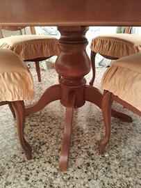 Tavolo rotondo con gamba centrale diametro cm. 120, allungabile cm 160. Quattro sedie in stile.