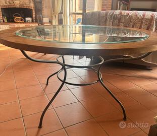 Tavolo rotondo design di lusso, cristallo temperato con circonferenza in legno pregiato, base in ferro battuto. diametro 150 cm. Ottima occasione!