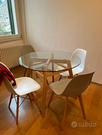 Tavolo rotondo in cristallo con gambe in legno Sedie in polipropilene con gambe in legno (2 colore bianco e 2 colore grigio chiaro) Ottime condizioni