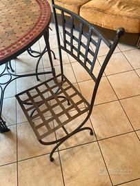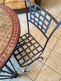Vendo tavolo rotondo in ferro battuto con piano in mosaico decorato nei toni del beige e rosso, completo di 4 sedie coordinate.