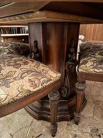 Tavolo rotondo in legno massello allungabile, diametro 120 cm, allungabile. con 6 sedie abbinate in stile classico. Struttura robusta con base centrale intagliata e dettagli decorativi. Le sedie hanno una seduta e schienale imbottiti con tessuto decorato, rifinito con borchie lungo il bordo.