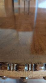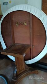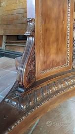 Vendo elegante tavolo rotondo in legno massello, caratterizzato da una solida struttura centrale con base scolpita e dettagli decorativi lungo il bordo. Il tavolo è robusto e stabile, con piano in buone condizioni generali (presenta normali segni di utilizzo compatibili con l’età). Ottima qualità costruttiva, non è un prodotto moderno economico. Diametro: 130