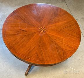 Tavolo rotondo in legno con intarsio e piedistallo centrale, in buone condizioni con qualche segno sul piano. Misura: 120cm. di diametro x 80cm. di altezza