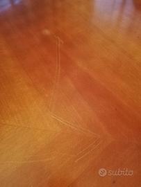 Tavolo rotondo in noce, diametro 130 cm, altezza 79 cm con prolunga da 50 cm (lieve rigatura sul piano del tavolo) + 6 sedie in noce imbottite con rivestimento in tessuto fiorato, larghezza 54 cm
