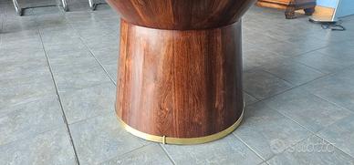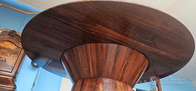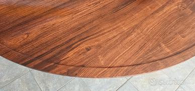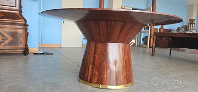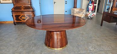 Per qualsiasi informazione contattatemi al 3403341898. Tavolo unico nel suo genere, realizzato da ebanisti in copia unica in elegante legno di Palissandro indiano, nella sua semplicità coniuga classico e moderno allo stesso tempo e con una finitura lucida che ne esalta la bellezza del legno. La base è impreziosita da un anello in ottone che aggiunge un tocco di lusso. Il piano è rotondo e ampio(diametro 166cm) con un bordo leggermente rialzato il quale ne delimita la circonferenza. La superfice riflettente indica una verniciatura di alta qualità. La base è a piedistallo con una forma a tronco di cono che si allarga verso il basso, essa contribuisce a dare un aspetto solido e un maggiore spazio per le gambe rispetto a un tavolo ordinario. Il design parte da una interpretazione moderna partendo da una estetica tradizionale dei mobili anni '50 e '60, le venature del legno disposte in modo tale da creare un movimento visivo, aggiungendo profondità e carattere. In sintesi si tratta di un tavolo raffinato, ideale per un ambiente che cerca un tocco di eleganza e calore. Diametro 166cm Altezza 80cm