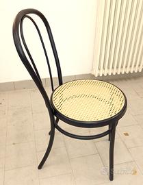 Le sedie, in ferro verniciato nero, hanno lo schienale alto 85 cm e la seduta, in vimini, diametro 40 cm.