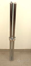 Le gambe sono in profilato tondo di acciaio cromato e hanno la possibilità di richiudersi permettendo di riporre il tavolo e le gambe occupando pochissimo spazio (vedi foto).