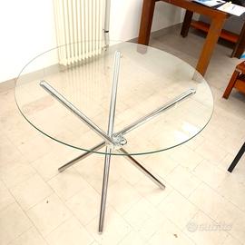 Vendo bellissimo tavolo rotondo con piano in vetro temperato e con quattro gambe a crociera in acciaio cromato