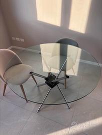 Vendo tavolo rotondo con piano in vetro temperato e struttura centrale in acciaio cromato con gambe incrociate "a razza". Stile Calligaris (purtroppo non sono sicura che sia davvero di marca).