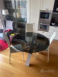 Tavolo rotondo in vetro temperato scuro Diametro 130 cm Base in acciaio effetto specchio Tenuto molto bene, senza difetti visibili. Perfetto per soggiorno o sala da pranzo, stabile e di grande impatto estetico.