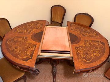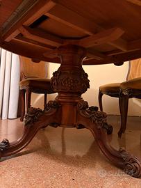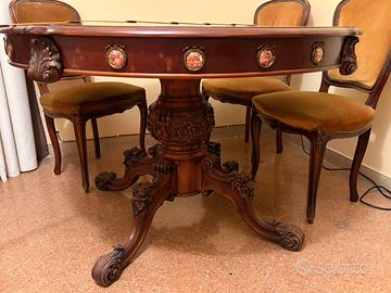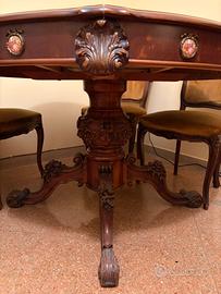 Bellissimo tavolo da pranzo rotondo in legno massiccio con intarsio floreale molto raffinato. Misure: • Chiuso: diametro 125 cm • Con prolunga centrale: 160 cm (perfetto per 6-8 persone) Condizione: Perfetto stato, nessun graffio, nessuna ammaccatura, nessun segno d’usura. Conservato con cura e pronto all’uso. Caratteristiche principali: • Piano con elaborato intarsio a fiori e volute su fondo noce • Medaglioni in porcellana dipinta sulla fascia perimetrale (dettaglio elegante) • Base centrale intagliata a mano con foglie, grappoli d’uva e volute • Quattro gambe cabriole con ricche sculture e terminazione a zampa di leone • Prolunga centrale inclusa Stile classico neobarocco / ispirato al XIX secolo, di ottima fattura artigianale italiana (probabile produzione anni ‘900 o primi ‘900). Il tavolo è stabile, pesante e di grande effetto in sala da pranzo.