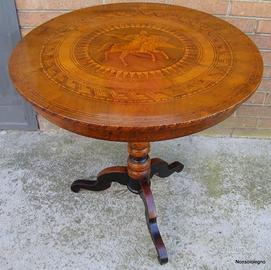 Raro e prezioso tavolo rotondo intarsiato Rolo, detto “Il Cavaliere”, in noce massello e tarsie di legni vari, risalente alla seconda metà del XIX secolo, rinvenuto in ottimo stato di conservazione e sapientemente ripristinato.