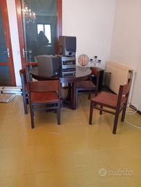 Tavolo Rotondo in Legno Massello Palissandro con 6 sedie stesso materiale, il tavolo si apre e diventa ovale offrendo ancora piú posti a sedere, é perfetto, praticamente come nuovo, usato poche volte, vendo per svuotamento casa. *Scusate gli oggetti momentaneamenti appoggiati sul tavolo, grazie