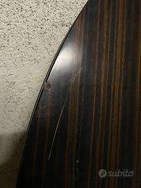 Vendesi tavolo di legno scuro comprese 6 sedie, rotondo, con la base rotonda, che si allunga al centro, inutilizzato da anni riposto in cantina ( no umidità / muffa) unico difetto in foto.