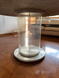 Tavolo rotondo con ripiano in marmo, stile moderno con corpo cilindrico trasparente in plexiglass e base rotonda in acciaio.