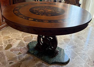 Tavolo rotondo in legno massello, diametro 135 cm circa, con decorazioni floreali, piede centrale intagliato con base in marmo verde. Il tavolo si trova a Sciacca.