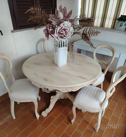 Splendido tavolo rotondo in stile shabby chic / classico provenzale, colore avorio anticato con lavorazioni intarsiate e gambe finemente scolpite.