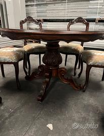 Vendo elegante tavolo rotondo in legno intarsiato, completo di sei sedie abbinate. Lavorazione artigianale in stile classico, perfetto per sala da pranzo o soggiorno. Solido, ben tenuto, con dettagli curati