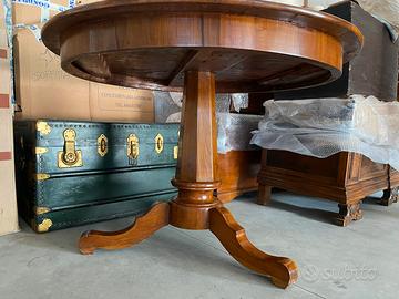 Vendo splendido tavolo rotondo in legno di noce massello, datato circa 1850. Struttura con colonna centrale e tre gambe finemente lavorate. Diametro 115 cm.