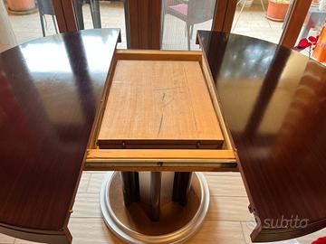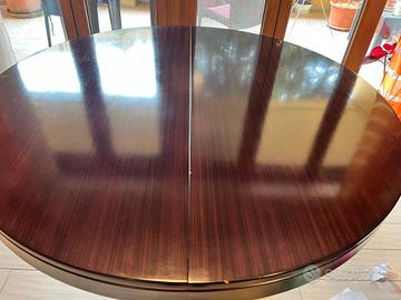 Vendesi elegante tavolo rotondo d'epoca (risalente a circa 50 anni fa), un pezzo di artigianato robusto e dal design senza tempo. Perfetto per chi ama lo stile vintage o cerca un mobile di qualità superiore rispetto alle produzioni moderne. Caratteristiche Principali: Materiale: Vero legno con finitura lucida tonalità noce scuro/mogano. Venature sul piano che donano un grande impatto estetico. Design: Base centrale a colonna su pedana circolare (stabile, nessuna gamba d'intralcio per i commensali). Sistema di Apertura: Meccanismo allungabile con allunga a libro centrale a scomparsa. Il tavolo si apre scorrendo su guide metalliche fluide; l'allunga è integrata sotto il piano e si posiziona con un semplice gesto. Stato di Conservazione: Struttura solida e meccanismi perfettamente funzionanti. Il piano presenta i normali segni del tempo che ne testimoniano l'autenticità, ma è pronto all'uso. Sulla pedata e base centrale a colonna sono presenti fori di tarli, trattato nel 2024. Dimensioni Chiuso: 116cm X 116cm Aperto: 116cm X 156cm Altezza: 79cm Posti a sedere: 4 da chiuso, 6/8 da aperto.