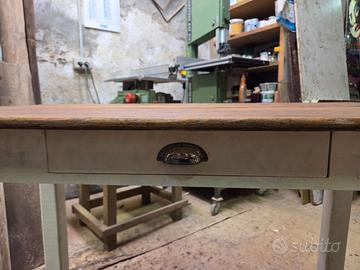 Adatto per cucina, piano di lavoro e scrivania Tavole di abete. CARATTERITISCHE Finitura: spazzolato Scelta: Rustico Lunghezza: 115 mm. Larghezza: 60 mm. Altezza: 79 mm. Con cassetto posate Gambe color bianco crema Top color legno