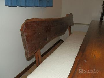 TAVOLO RUSTICO PER TAVERNA Tavolo da taverna completo di tre panche, in legno massiccio lavorato e intagliato a mano, tutto ricavato da un unico tronco, complete di cuscini imbottiti su misura in canapone beige chiaro, tutto come nuovo, vendo per trasloco, composto da: - n° 1 tavolo da cm 220 x 56 - n° 2 panche laterali da cm 150 - n° 1 panca frontale da cm 105 Rispondere via mail indicando n° di cell per essere ricontattati, ritiro a carico dell’acquirente, no perditempo.- Prezzo € 400,00
