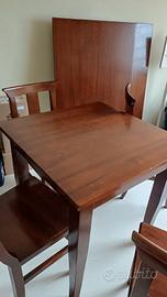Tavolo sala 80x80 con 4 sedie in legno massiccio. È predisposto per essere allungato con due prolunghe di 1 metro ciascuna. Si raggiunge la lunghezza di 2,80 metri e ci si possono accomodare 12 persone. Il tavolo presenta un graffio nella parte superiore facilmente stuccabile.